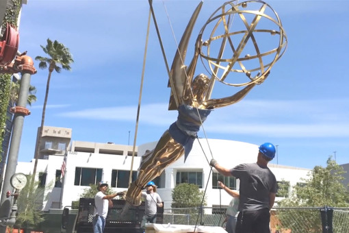 In May of 1991, the Television Academy moved into its new headquarters at the corner of Lankershim and Magnolia Boulevards, replete with an enormous fountain dominated by a 27-foot Emmy Award statue. The statue and Hall of Fame Plaza were conceived and overseen by production designer Jan Scott, winner of 11 Primetime Emmy awards—more than any other woman in the history of television.